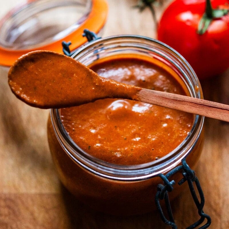 Here’s the easiest tastiest Enchilada Sauce that requires no cooking, no chopping and can be made in literally five minutes, using a blender! You’ll never buy it again! Full of flavor, this red Enchilada Sauce is silky smooth and perfect for Vegetarian Enchiladas, Chicken Enchiladas, smothered burritos, or Enchilada Pie.