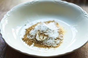 The coating for the fish is a mix of flour, coriander, salt and pepper and a little corn meal for a good crunchy texture.