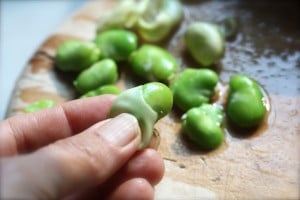 Shelling a fava bean is very much like shelling a pea pod. You just tug on little string and pull it down and the pod opens up easily. Inside there are four to five plump creamy green-colored beans. It really doesn’t take long to shell them from their pods.