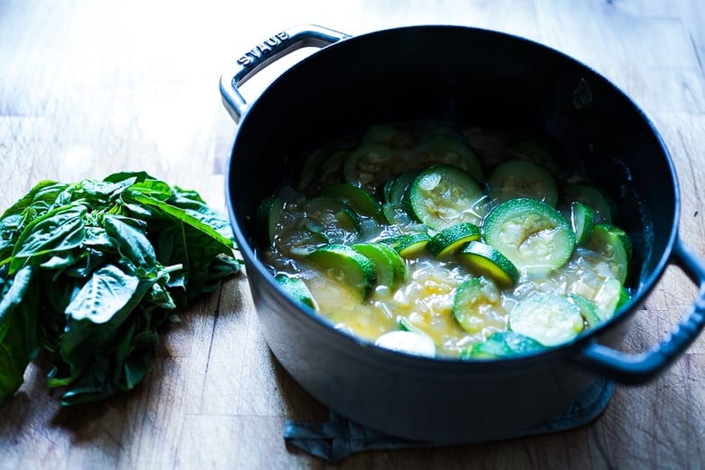 2. Add chopped zucchini and water ( or stock), salt and pepper. Bring just under a boil over high heat, cover, turn the heat down to med-low, and simmer for 15 minutes, giving a stir halfway through. Cook until zucchini is translucent and fork tender.