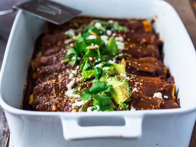These enchiladas can also be frozen-baked or unbaked. Wrap tightly before placing in the freezer for up to 3 months. Thaw completely overnight in the fridge before baking, bringing it to room temperature first. These make a great freezer meal to give away or keep!